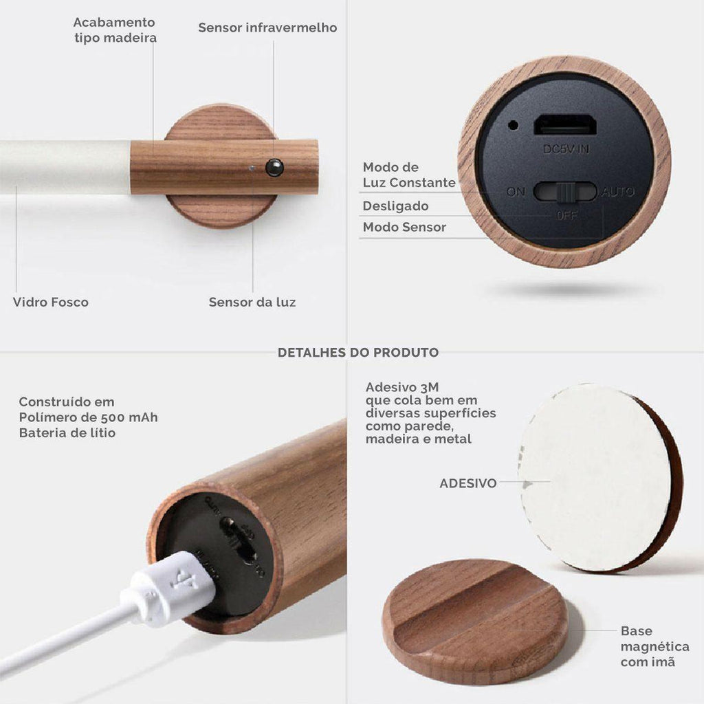 Tem sensor de movimento e carregamento via USB, sendo útil e adaptável a qualquer espaço, como escritório, salas, corredores, quarto, trabalho, mesa, armários, escadas, etc.